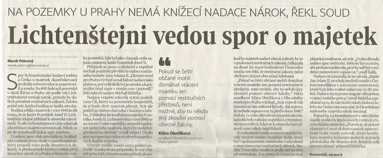 Hospodářské noviny, 12. listopadu 2015: Lichtenštejni vedou spor o majetek